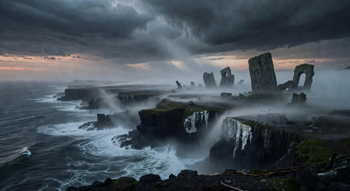 Lieu : « foggy coastline », « ancient stone ruins », « desolate lighthouse », « dark forest edge », « abandoned port at dusk », « vast empty sea under stormy sky ». Lumière : « single lighthouse beam cutting through fog », « overcast sky, no direct sun », « volumetric fog, soft diffused light », « candlelight from a single window ». Style : « cinematic stills », « cinema photography », « 35mm anamorphic », « natural film grain », « muted colors », « desaturated, cold tones ». À éviter : « bright », « colorful », « futuristic », « 3D render », « neon ».