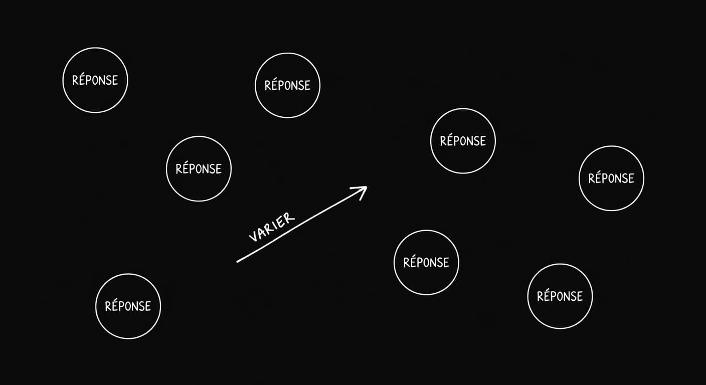 Les modèles de langage sont entraînés à être cohérents et prévisibles sur des demandes similaires. Même question → même type de réponse. Pour avoir des sorties différentes, il faut changer quelque chose : la façon de demander, le contexte que tu donnes, ou un paramètre (comme la température dans les APIs) qui contrôle l'aléatoire. Pas de magie : tu « bouscules » un peu l'entrée ou les réglages pour que la sortie dévie.